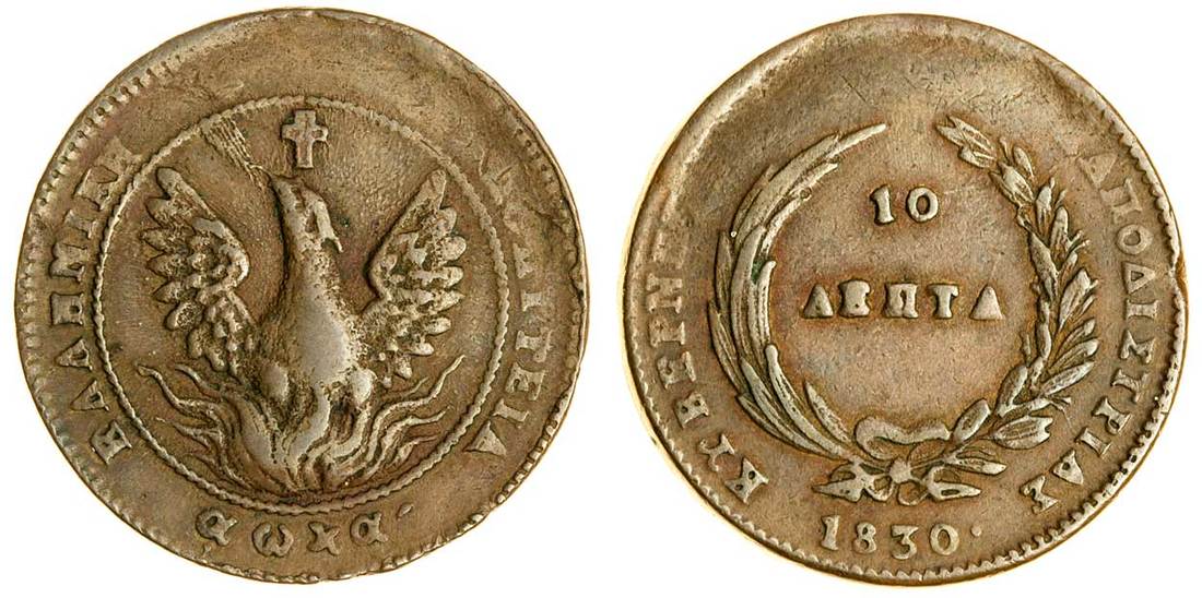(x) John Capodistrias (1828-31), 10-Lepta, 1830, mint of Aegina, phoenix in chevron circle, Greek date below, rev. value in wreath, date below (Divo 3a; KM 8), both legends very weak at top, fine