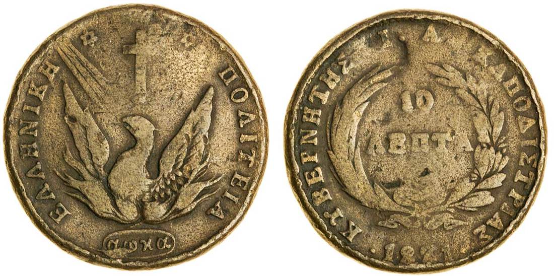 (x) John Capodistrias (1828-31), 10-Lepta, 1831, mint of Aegina, phoenix, no inner circle, Greek date in cartouche below, rev. value in wreath, date below (Divo 4; KM 12), fine