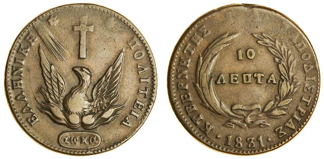 (x) John Capodistrias (1828-31), 10-Lepta, 1831, mint of Aegina, phoenix, no inner circle, Greek date in cartouche below, rev. value in wreath, date below (Divo 4; KM 12), good very fine0