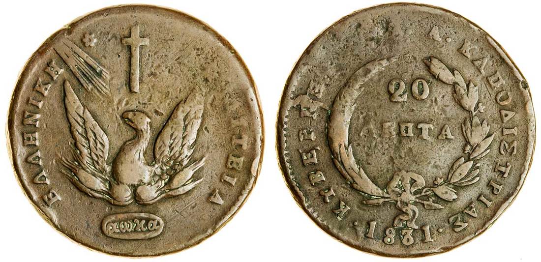(x) John Capodistrias (1828-31), 20-Lepta, 1831, mint of Aegina, phoenix, no inner circle, Greek date in cartouche below, rev. value in wreath, date below (Divo 2; KM 11), part of legends weak, fine