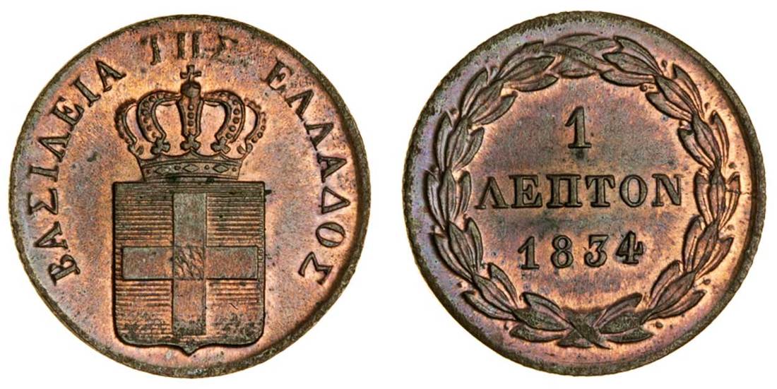 (x) Otho (1832-62), Lepton, 1834, Munich, crowned shield, rev. value in wreath (Divo 29c; KM 13), PCGS MS 65 RB