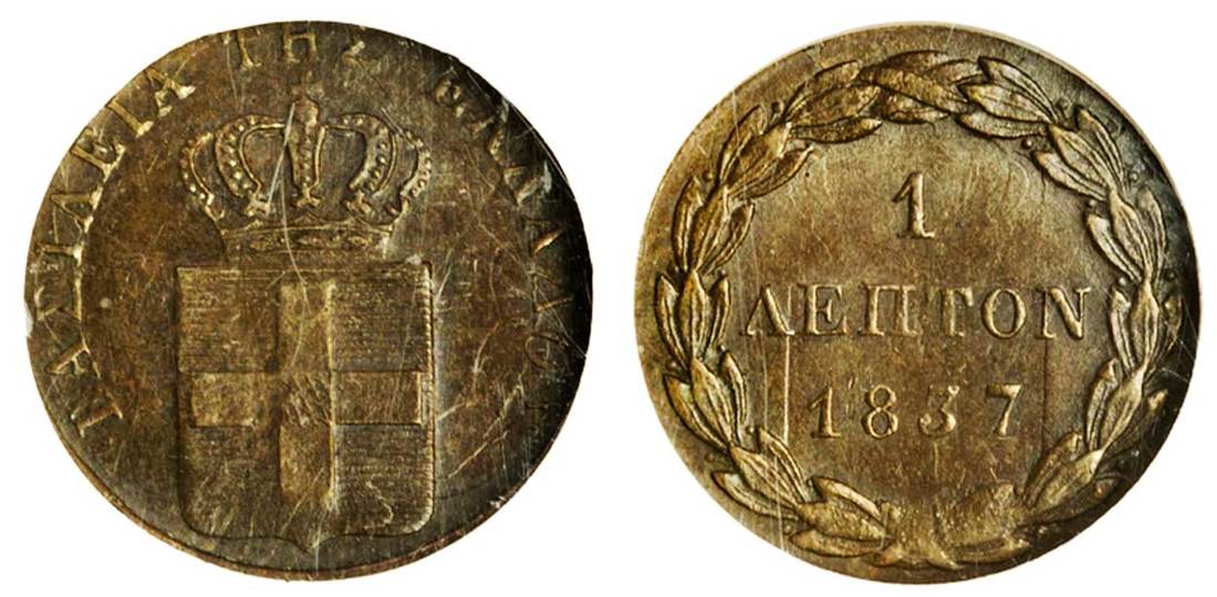 (x) Otho (1832-62), Lepton, 1837, Athens, crowned shield, rev. value in wreath (Divo 29d; KM 13), NGC MS 63 BN, a scarce date