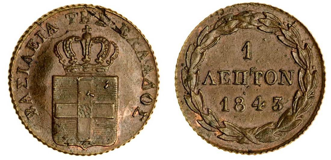 (x) Otho (1832-62), Lepton, 1843, Athens, crowned shield, rev. value in wreath (Divo 29k; KM 13), PCGS MS 62 BN