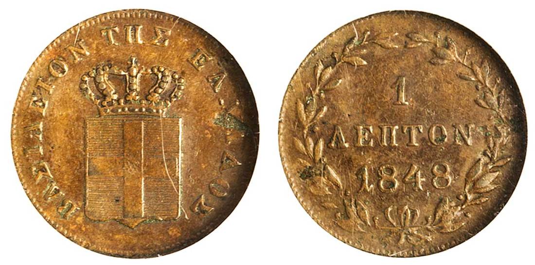 (x) Otho (1832-62), Lepton, 1848, Athens, crowned shield, rev. value in wreath (Divo 31b; KM 26), NGC AU 50 BN
