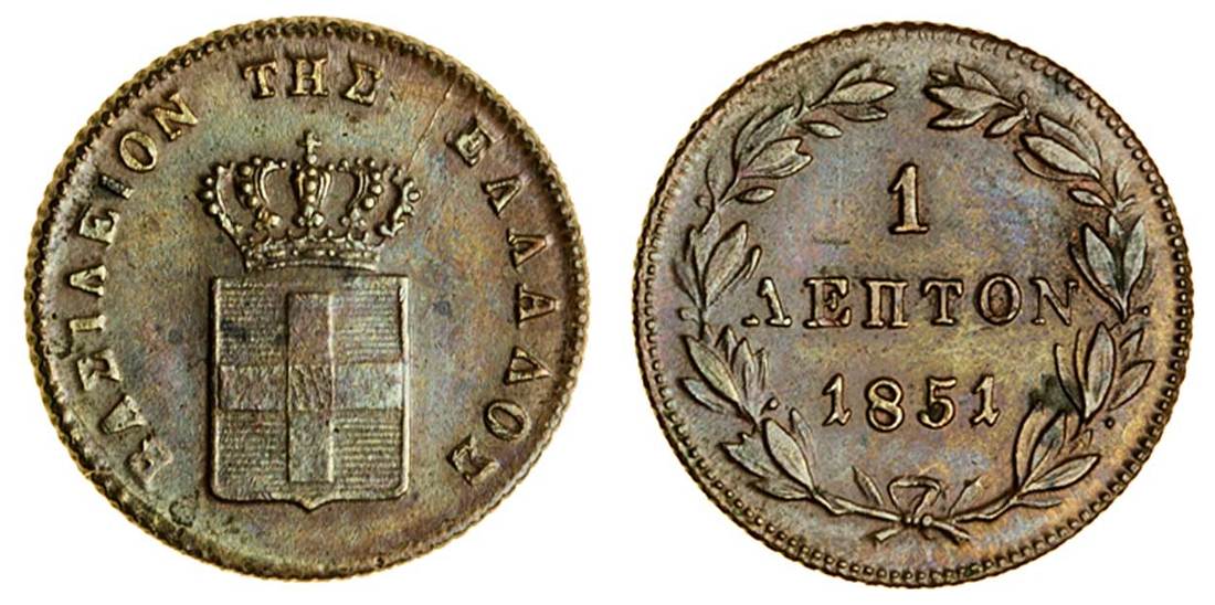 (x) Otho (1832-62), Lepton, 1851, Athens, crowned shield, rev. value in wreath (Divo 32a; KM 30), a few dark spots, extremely fine