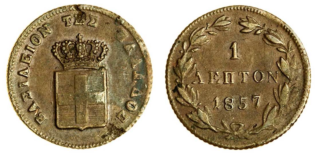 (x) Otho (1832-62), Lepton, 1857, Athens, crowned shield, rev. value in wreath (Divo 32b; KM 30), flaws on obverse, good very fine