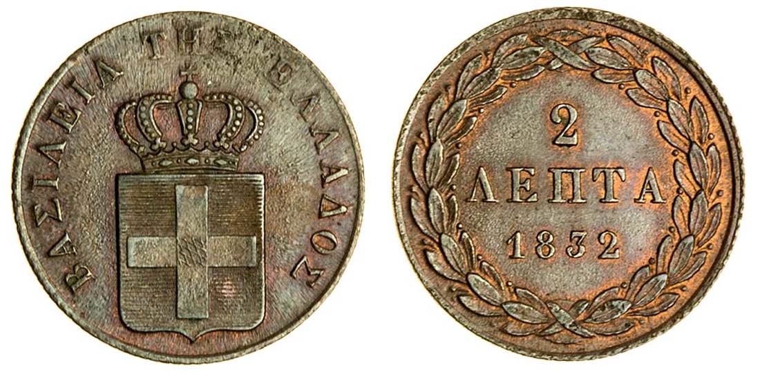 (x) Otho (1832-62), 2-Lepta, 1832, Athens, crowned shield, rev. value in wreath (Divo 25a; KM 14), PCGS MS 65 BN