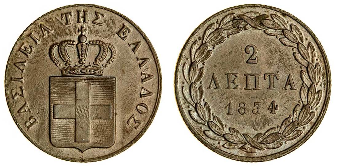 (x) Otho (1832-62), 2-Lepta, 1834, Munich, crowned shield, rev. value in wreath, wide date (Divo 25c; KM 14), PCGS MS 64 BN