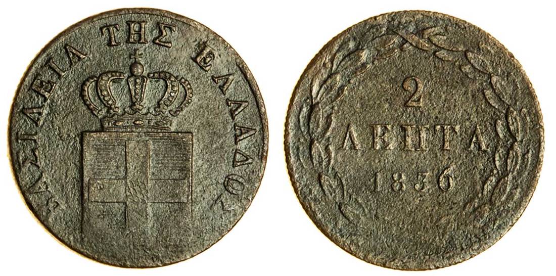 (x) Otho (1832-62), 2-Lepta, 1836, Athens, crowned shield, rev. value in wreath (Divo 25d; KM 14), weak at bottom of shield, PCGS env. damage XF details, a scarce date