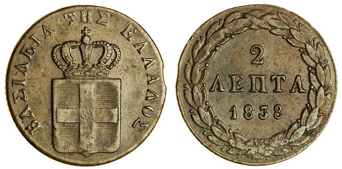 (x) Otho (1832-62), 2-Lepta, 1838, Athens, crowned shield, rev. value in wreath (Divo 25f; KM 14), very fine