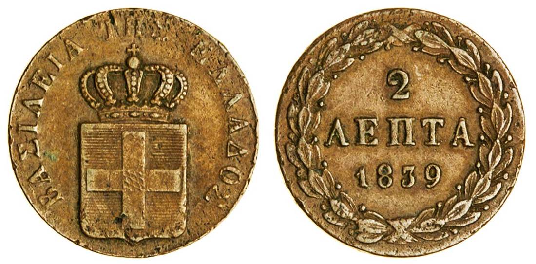 (x) Otho (1832-62), 2-Lepta, 1839, Athens, crowned shield, rev. value in wreath (Divo 25g; KM 14), very fine