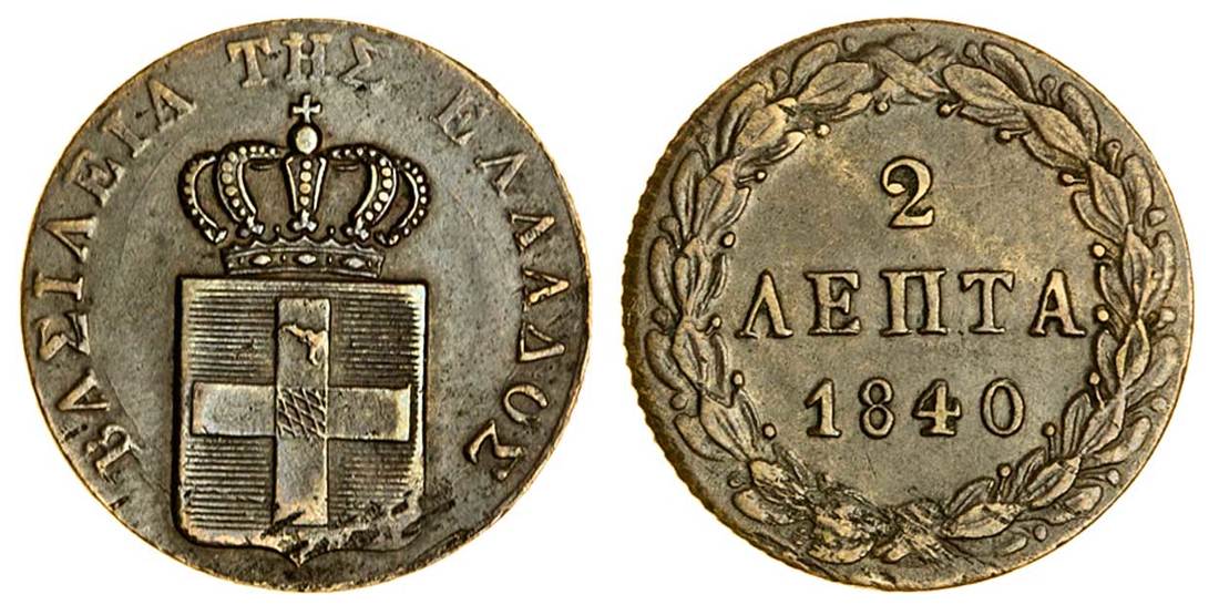 (x) Otho (1832-62), 2-Lepta, 1840, Athens, crowned shield, rev. value in wreath (Divo 25h; KM 14), metal flaws at base of shield and wreath, very fine