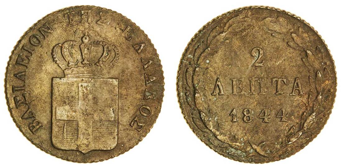 (x) Otho (1832-62), 2-Lepta, 1844, Athens, crowned shield, rev. value in wreath (Divo 26a; KM 23), good very fine