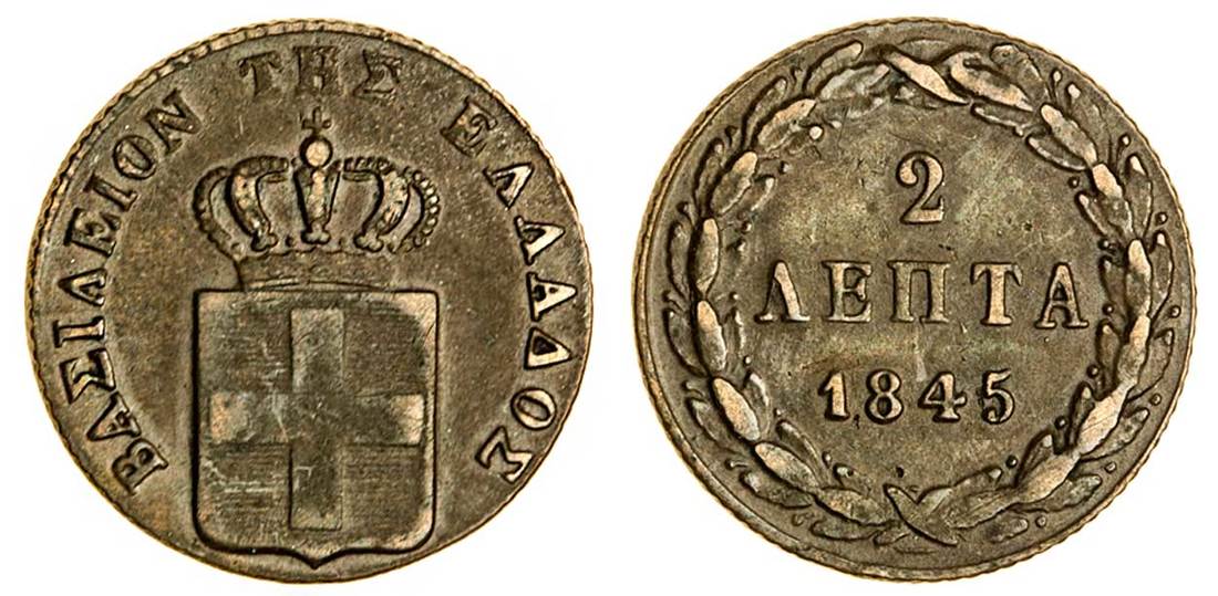 (x) Otho (1832-62), 2-Lepta, 1845, Athens, crowned shield, rev. value in wreath (Divo 26b; KM 23), very fine