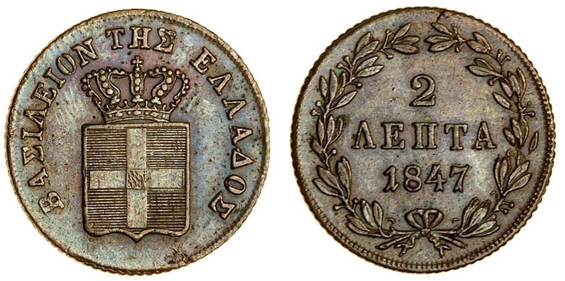 (x) Otho (1832-62), 2-Lepta, 1847, Athens, crowned shield, rev. value in wreath (Divo 27a; KM 27), PCGS MS 62 BN, a scarce date