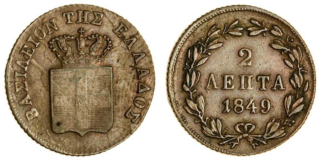 (x) Otho (1832-62), 2-Lepta, 1849, Athens, crowned shield, rev. value in wreath (Divo 27c; KM 27), very fine