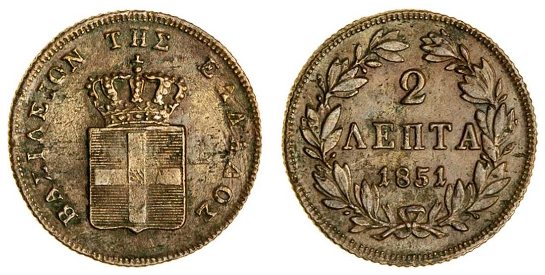 (x) Otho (1832-62), 2-Lepta, 1851, Athens, crowned shield, rev. value in wreath (Divo 28a; KM 31), surface metal flaws, good very fine