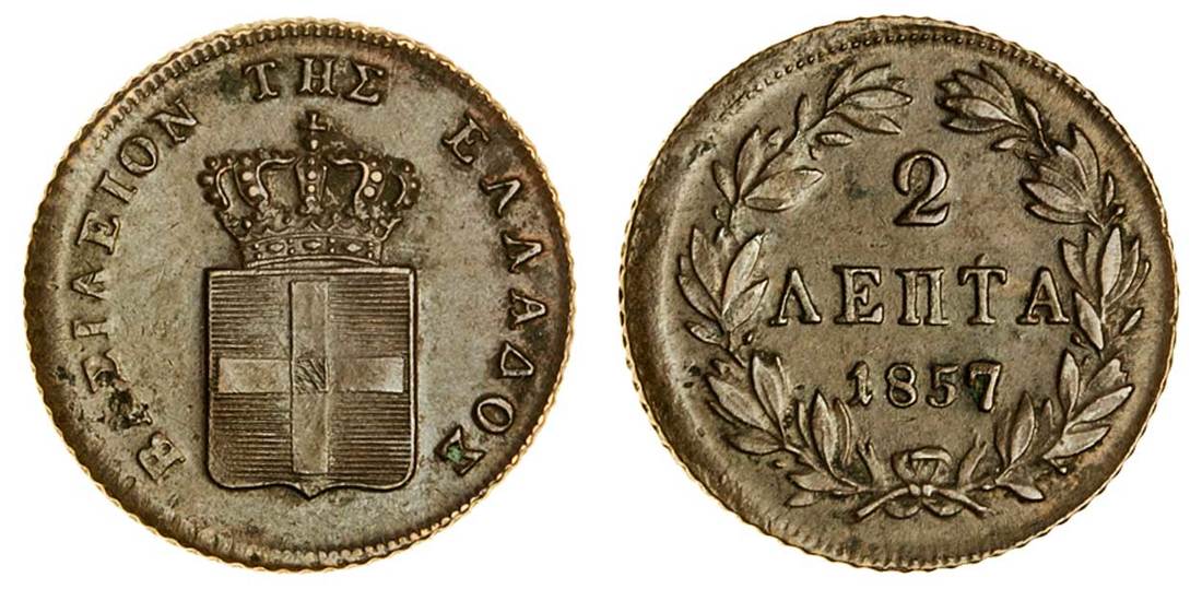 (x) Otho (1832-62), 2-Lepta, 1857, Athens, crowned shield, rev. value in wreath (Divo 28b; KM 31), extremely fine