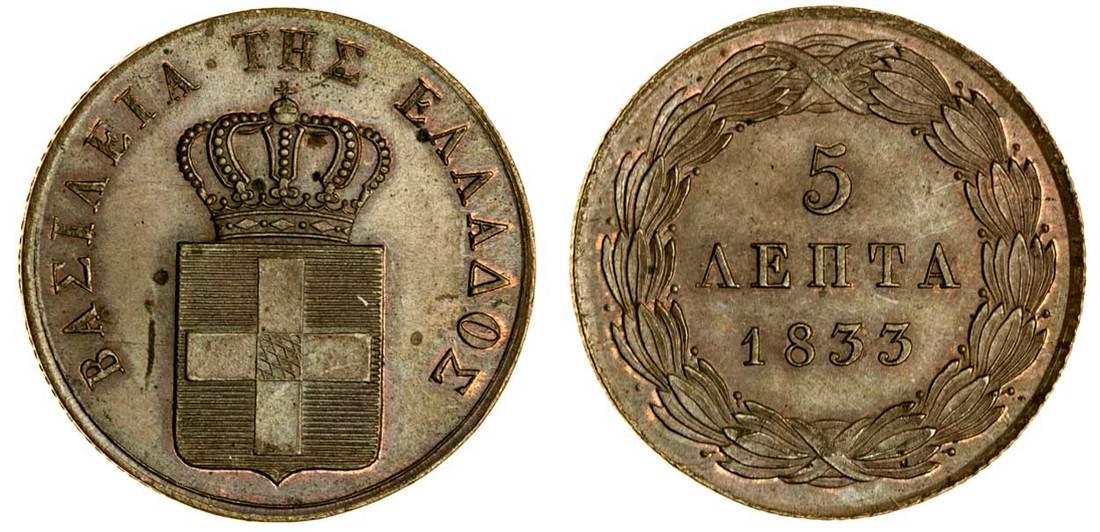 (x) Otho (1832-62), 5-Lepta, 1833, Munich, crowned shield, rev. value in wreath (Divo 21a; KM 16), about uncirculated, brown