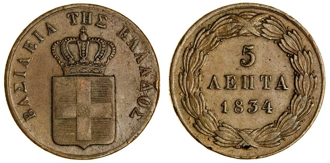 (x) Otho (1832-62), 5-Lepta, 1834, Munich, crowned shield, rev. value in wreath (Divo 21b; KM 16), very fine