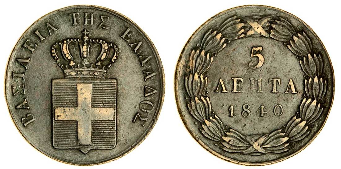 (x) Otho (1832-62), 5-Lepta, 1840, Athens, crowned shield, rev. value in wreath (Divo 21g; KM 16), weak 4 in date, very fine