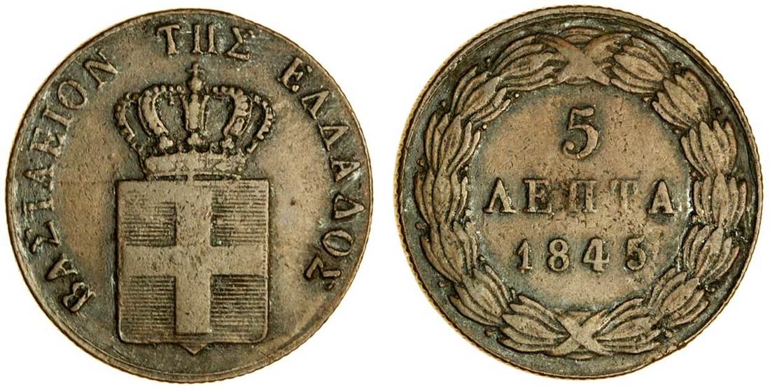 (x) Otho (1832-62), 5-Lepta, 1845, Athens, crowned shield, rev. value in wreath (Divo 22b; KM 24), nearly very fine