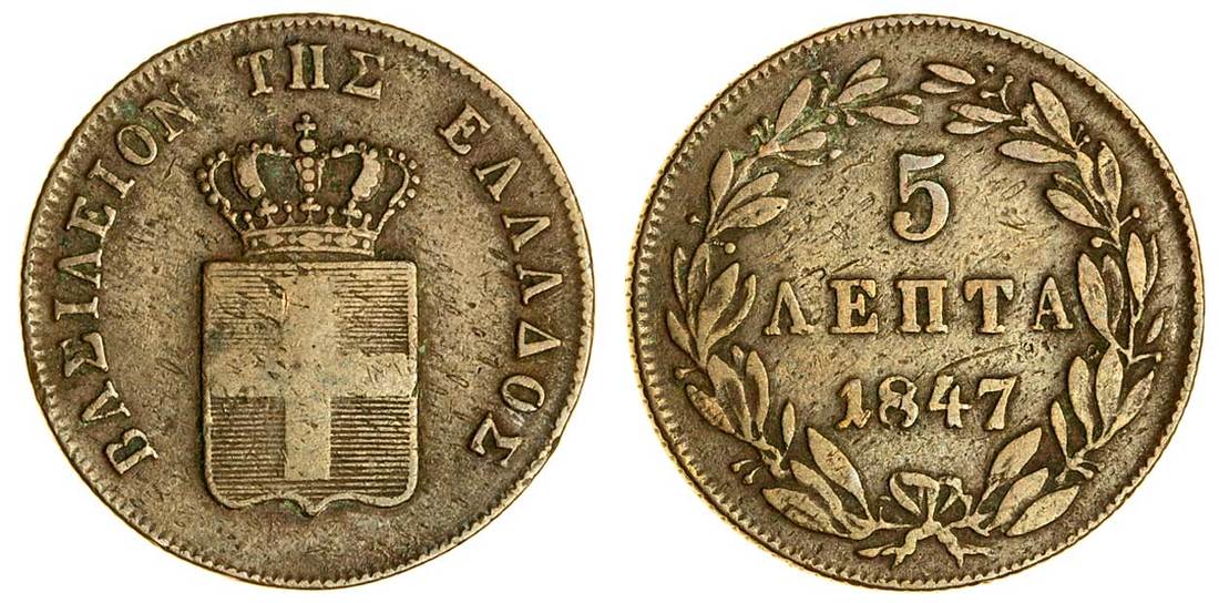 (x) Otho (1832-62), 5-Lepta, 1847, Athens, crowned shield, rev. value in wreath (Divo 23a; KM 28), nearly very fine