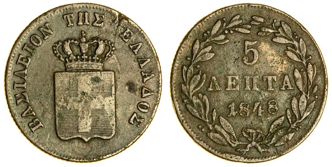 (x) Otho (1832-62), 5-Lepta, 1848, Athens, crowned shield, rev. value in wreath (Divo 23b; KM 28), die crack, nearly very fine