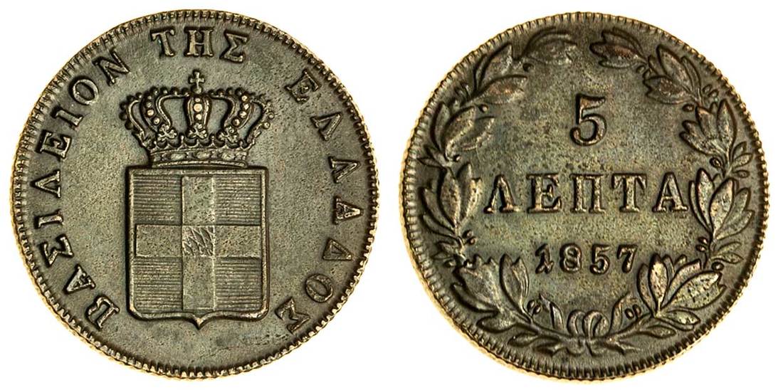 (x) Otho (1832-62), 5-Lepta, 1857, Athens, crowned shield, rev. value in wreath (Divo 24b; KM 28), PCGS AU 55