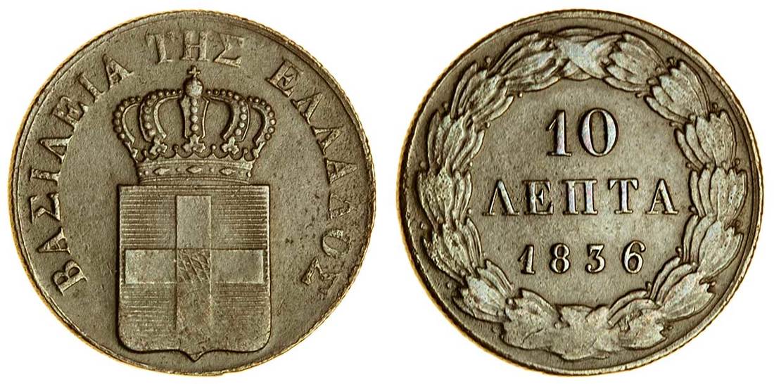 (x) Otho (1832-62), 10-Lepta, 1836, Athens, crowned shield, rev. value in wreath (Divo 18b; KM17), extremely fine