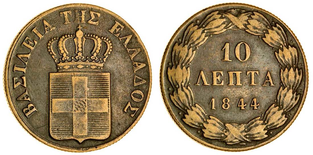 (x) Otho (1832-62), 10-Lepta, 1844, Athens, crowned shield, legend reads baieia, rev. value in wreath (Divo 18f; KM 17), PCGS XF 45