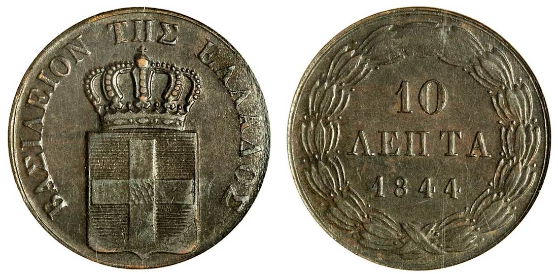 (x) Otho (1832-62), 10-Lepta, 1844, Athens, crowned shield, legend reads baieion, rev. value in wreath (Divo 19a; KM 25), NGC AU 55 BN