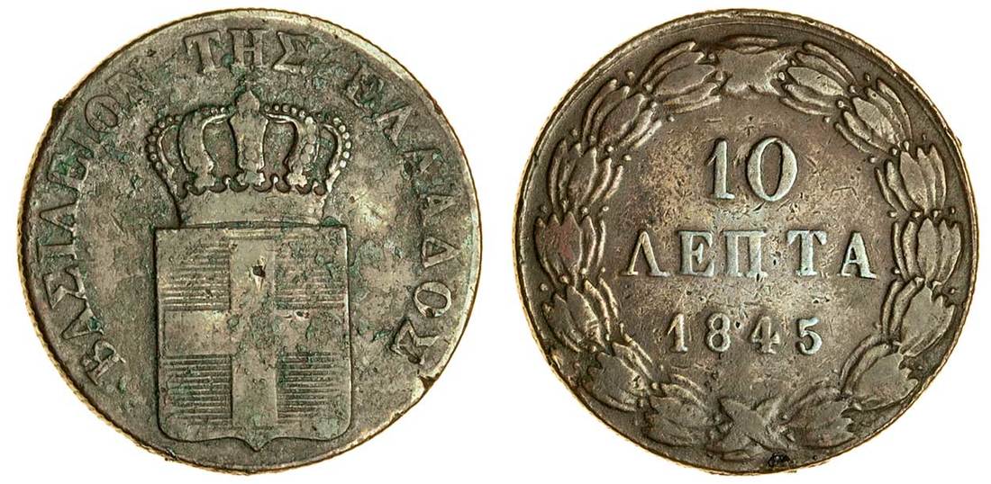 (x) Otho (1832-62), 10-Lepta, 1845, Athens, crowned shield, rev. value in wreath, medal alignment (Divo 19b; KM 25), cleaned but still with some verdigris, nearly very fine