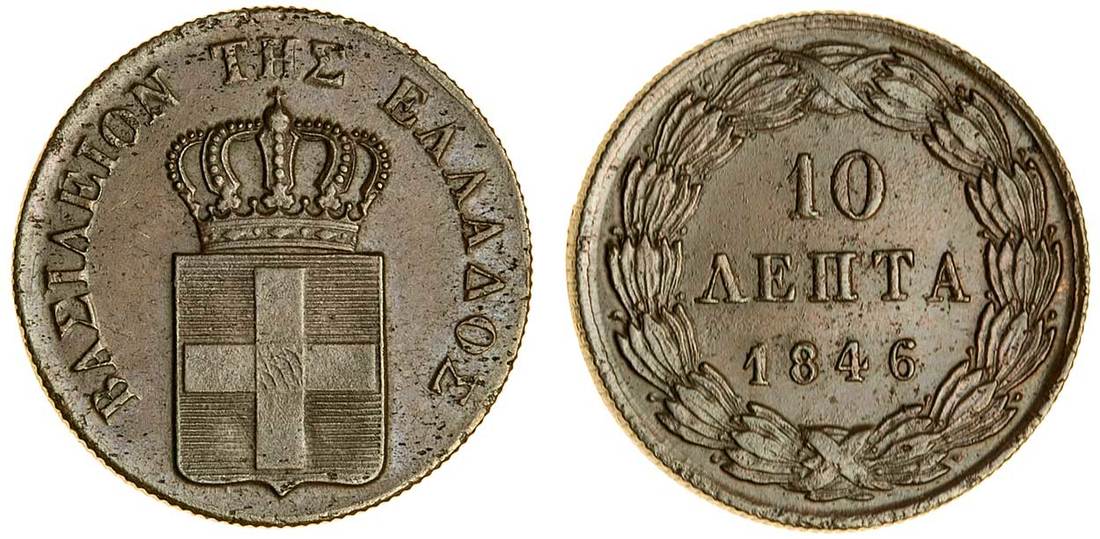(x) Otho (1832-62), 10-Lepta, 1846, Athens, crowned shield, rev. value in wreath (Divo 19c; KM 25), about extremely fine