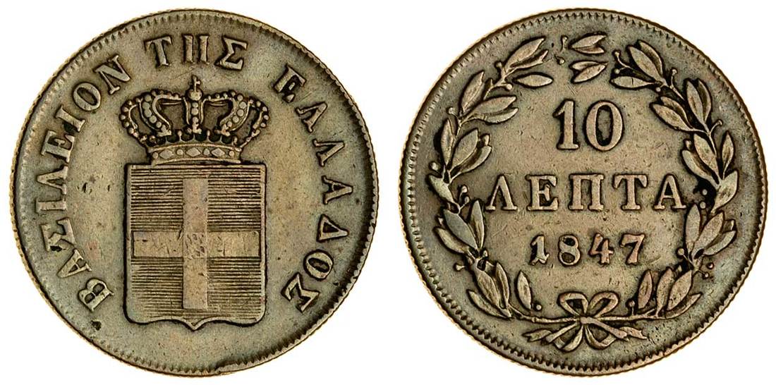 (x) Otho (1832-62), 10-Lepta, 1847, Athens, crowned shield, rev. value in wreath (Divo 20a; KM 29), cleaned, very fine