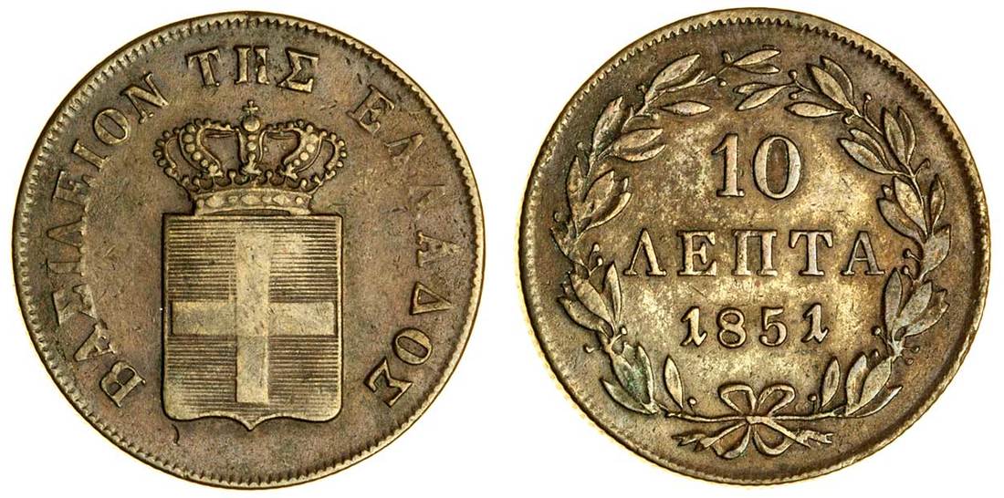 (x) Otho (1832-62), 10-Lepta, 1851, Athens, crowned shield, rev. value in wreath, narrow date (Divo 20f; KM 29), good very fine
