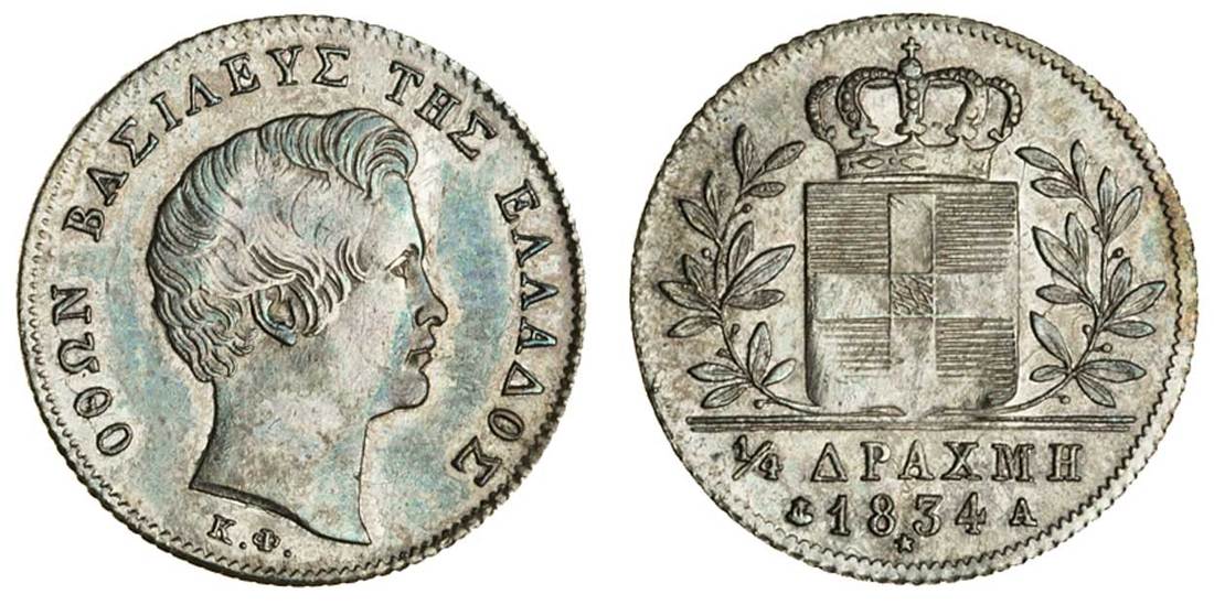 (x) Otho (1832-62), Quarter-Drachma, 1834, Paris, young bare head right, rev. crowned shield in wreath, value and date in exergue, anchor to left and a to right of date, star below (Divo 16b; KM 18), PCGS genuine, cleaning, AU details