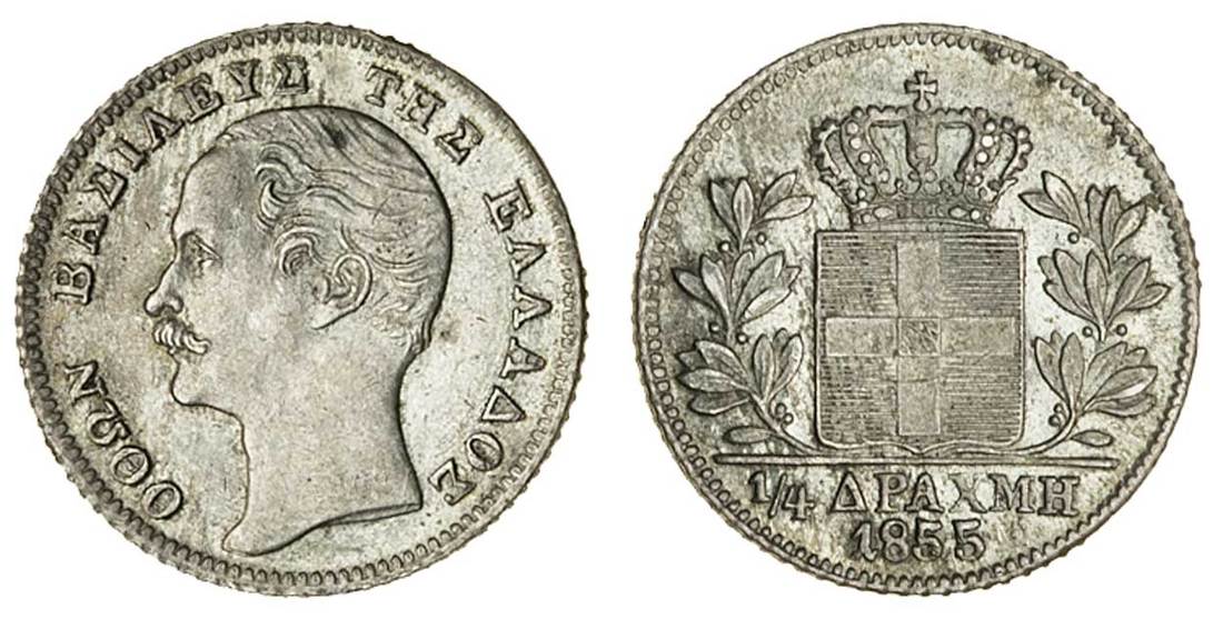 (x) Otho (1832-62), Quarter-Drachma, 1855, Vienna, older bare head left, rev. crowned shield in wreath, value and date in exergue (Divo 17b; KM 33), PCGS AU 58, scarce