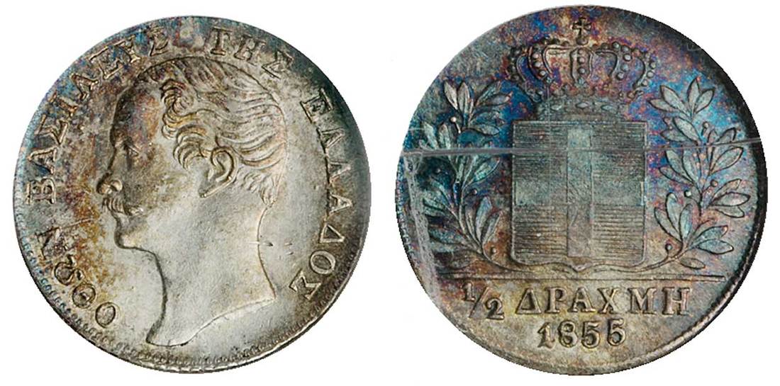 (x) Otho (1832-62), Half-Drachma, 1855, Vienna, older bare head left, rev. crowned shield in wreath, value and date in exergue (Divo 15b; KM 34), NGC MS 61, holder cracked