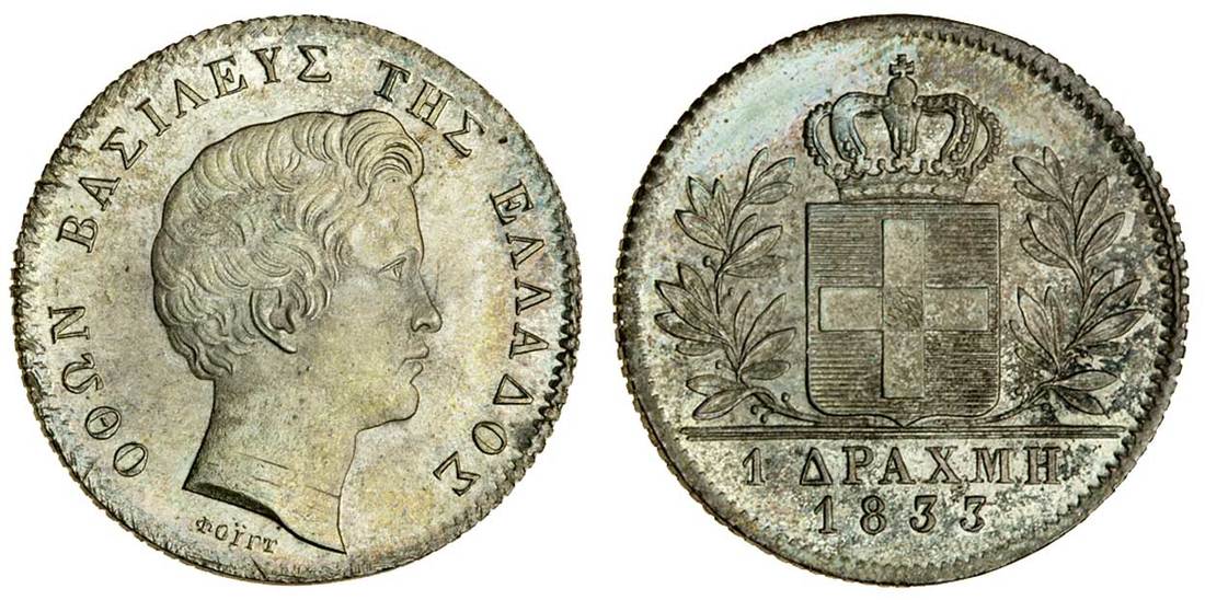 (x) Otho (1832-62), Drachma, 1833, Munich, young bare head right, rev. crowned shield in wreath, value and date in exergue (Divo 12c; KM 15), PCGS cleaning, UNC details