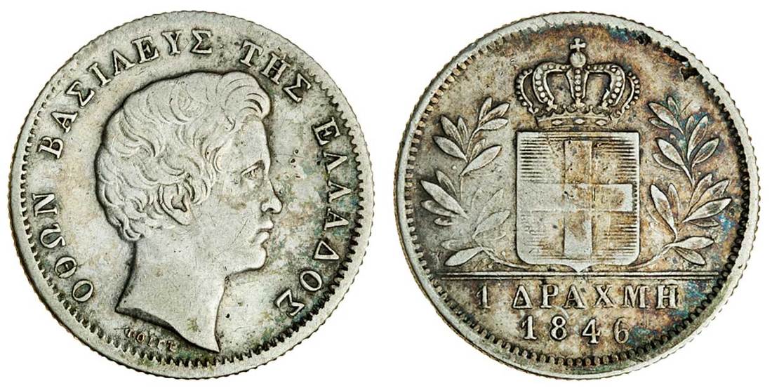 (x) Otho (1832-62), Drachma, 1846, Athens, young bare head right, rev. crowned shield in wreath, value and date in exergue (Divo 12f; KM 15), PCGS VF 35, rare