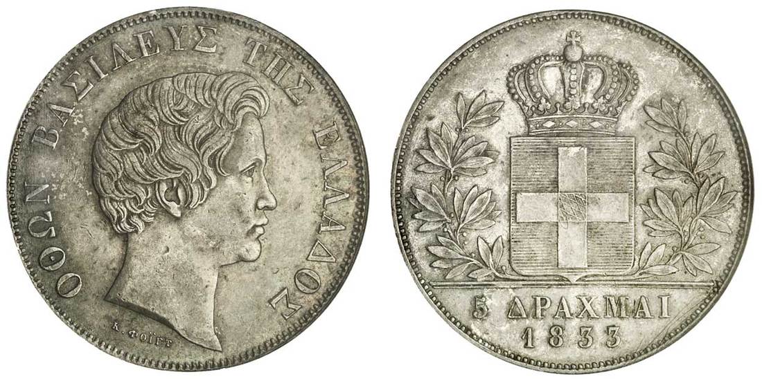 (x) Otho (1832-62), 5-Drachmai, 1833, Munich, young bare head right, signature below, rev. crowned shield in wreath, value and date in exergue (Dav.115; Divo 10a; KM 20), NGC AU 58
