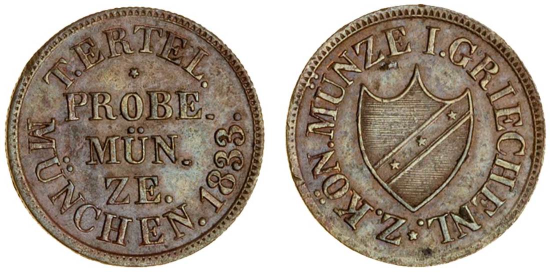 (x) Otho (1832-62), pattern lepton, 1833, by Ertel, Munich, legend with date, rev. shield (Divo P42), PCGS SP 55