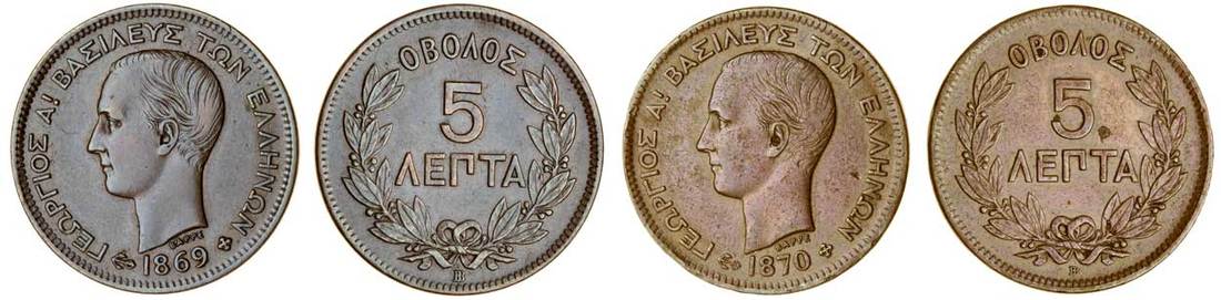 (x) George I (1863-1913), 5-Lepta (2), 1869 BB and 1870 BB, Strasbourg, bare head left, rev. value in wreath (Divo 63a, 63b; KM 42), first extremely fine, the second cleaned, very fine, scarce (2)