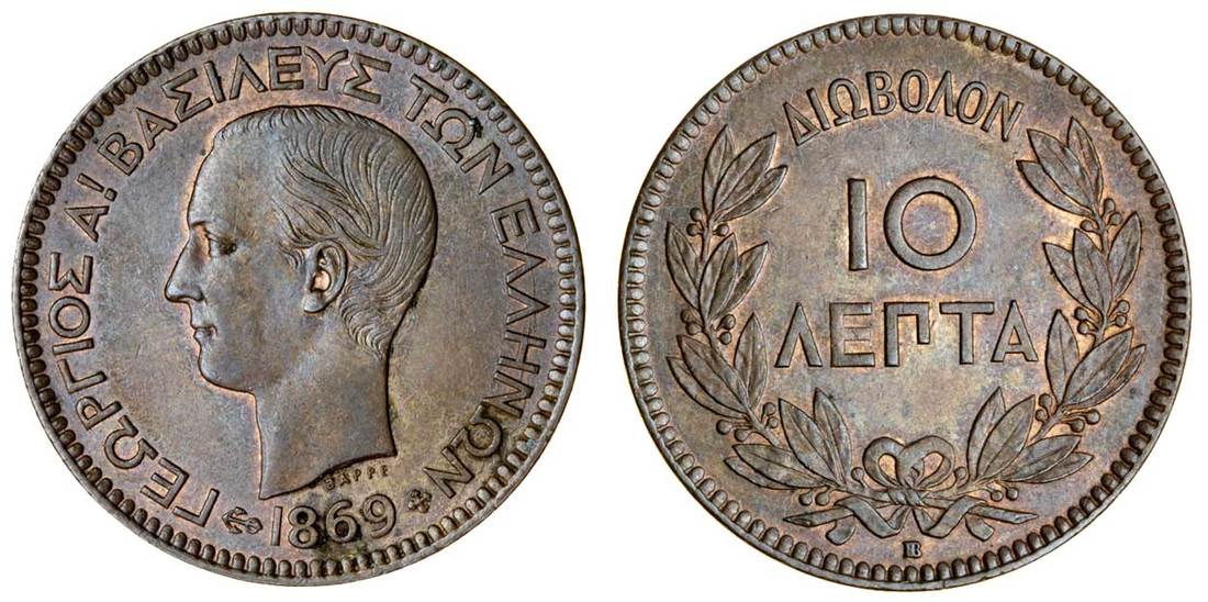 (x) George I (1863-1913), 10-Lepta, 1869 BB, Strasbourg, bare head left, rev. value in wreath (Divo 59a; KM 43), about uncirculated, with some lustre