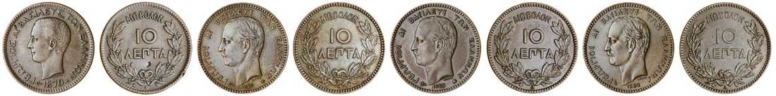 (x) George I (1863-1913), 10-Lepta (4), 1870 BB, Strasbourg, 1878 K, Bordeaux, 1879 A, 1882 A, Paris, bare head left, rev. value in wreath (Divo 59b 60a 60b, 60c; KM 43, 55), first fine, others very fine to extremely fine (4)