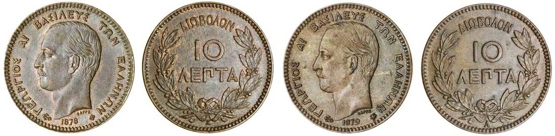 (x) George I (1863-1913), 10-Lepta, 1878 K, Bordeaux, 1879 A, Paris, bare head left, rev. value in wreath (Divo 60a, 60b; KM 55), about uncirculated, with some lustre, and extremely fine (2)