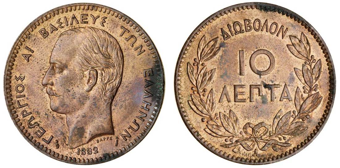 (x) George I (1863-1913), 10-Lepta, 1882 A, Paris, bare head left, rev. value in wreath (Divo 60c; KM 55), some dark spots but uncirculated and with lustre
