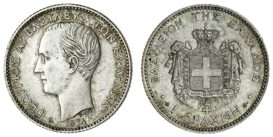 (x) George I (1863-1913), Drachma, 1874 A, Paris, bare head left, date and mint letter below, rev. crowned shield, value and mint marks bee and anchor below (Divo 53c; KM 38), extremely fine