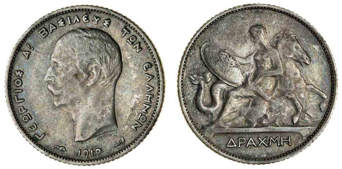 (x) George I (1863-1913), Drachma, 1910 A, Paris, bare head left, date and mint marks torch and cornucopia below, rev. Thetis on a seahorse, value below (Divo 54a; KM 60), nearly extremely fine